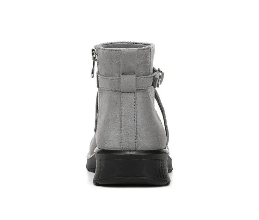 With a softly slouched silhouette and buckle accent, this ankle boot delivers everyday comfort with casual charm. The synthetic upper features a wraparound strap for added style, while an inside zipper ensures easy on and off. A cushioned insole keeps each step supported, and the low wedge heel provides a touch of lift without compromising stability. Finished with a textured outsole for reliable grip, this versatile boot is perfect for daily wear in cool weather.