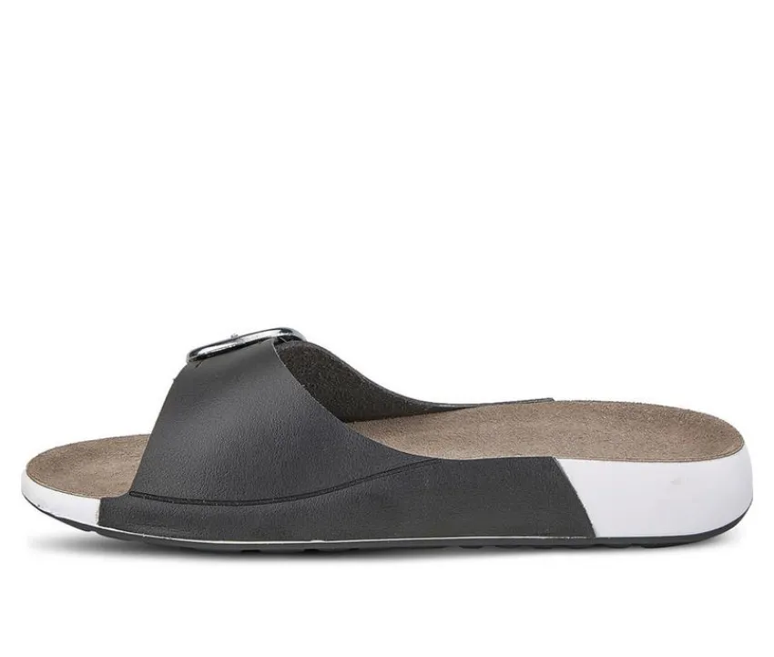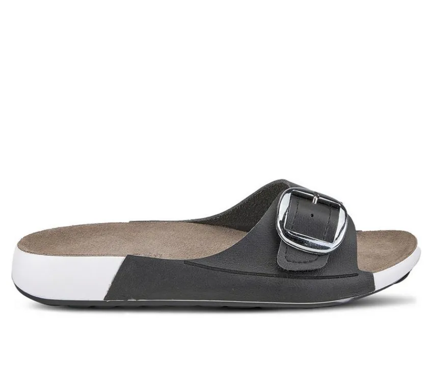 Flat oval slide sandal with silver square buckle for adjustability on comfortable footbed.