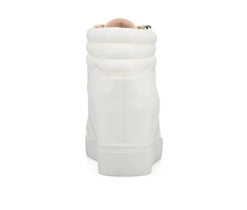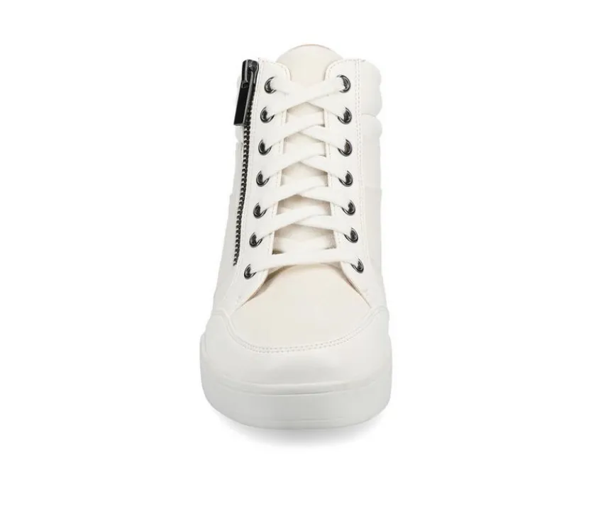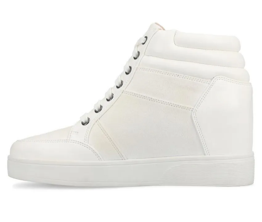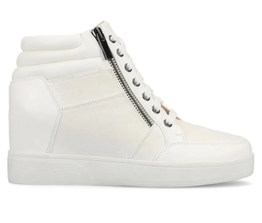 These high-top sneakers bring a stylish boost with a hidden wedge design. The smooth upper pairs with a supportive round toe, while the outside zipper ensures easy on-and-off wear. A cushioned insole provides comfort for long days, making these a must-have for sporty-chic looks. The combination of sneaker practicality and wedge height delivers the best of both worlds.