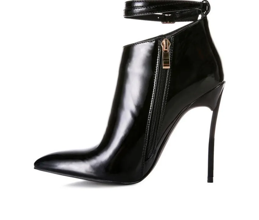 Style knows no bounds with these in your wardrobe. Drooling pointed high heeled booties in sharp pointed toes which shine in great finish and construction, these have a side zipper opening and come with a decorative pin buckle at the ankle. A perfect season transition style, for all occasions! Outer material: Polyurethane. Lining Material: Synthetic. Outer sole: TPR. Closed Pointed Toe. High Heel Sandals. Side Zipper Fastening. Pin Buckle Ankle Band. Party Wear Boots. SH3416.