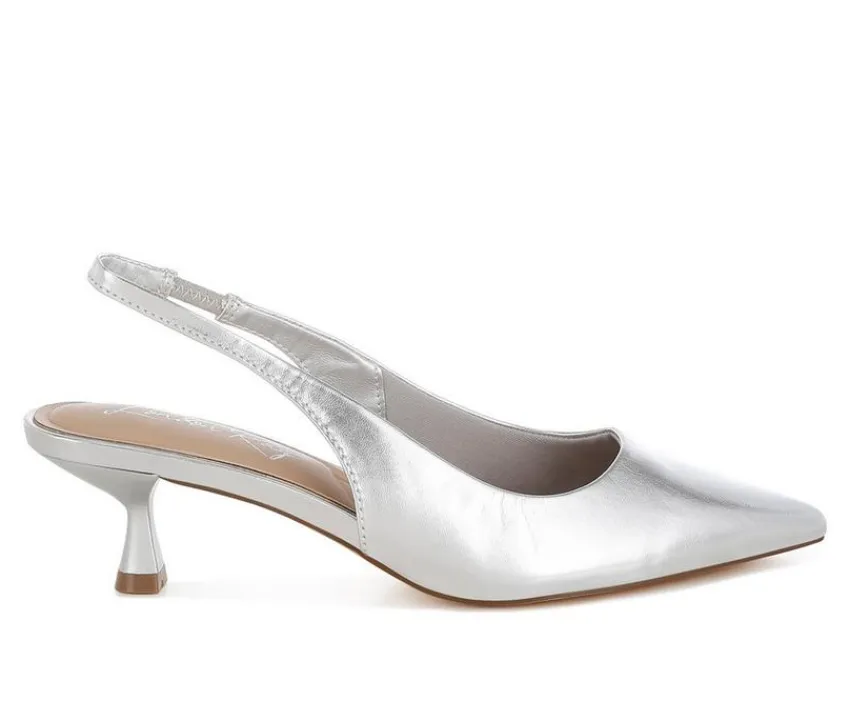 Classic and versatile, these slingback sandals elevate any outfit with their pointed toe and kitten heel. A subtle elastic gusset ensures flexibility, while the cushioned insole offers lasting comfort for all-day wear.