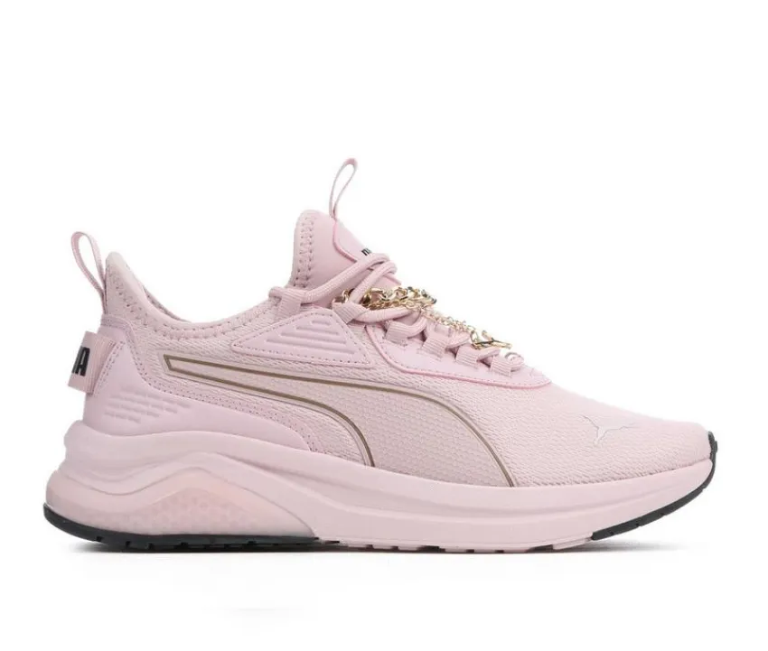 Designed for statement-makers who won’t compromise on performance, this athletic sneaker blends streetwear flair with sport-ready features. The breathable mesh upper is styled with sleek layered panels and a gold-tone chain embellishment for a bold finish. A sculpted midsole and traction-ready outsole support active movement, while the padded collar keeps every step plush and steady. Finished with Puma’s signature formstrip and logo details, it’s a head-turning essential built for all-day wear.