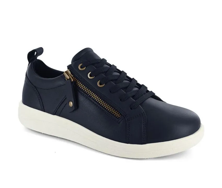 Enjoy everyday comfort and polished style with this modern sneaker built for support and ease. The Strive Talia features a smooth synthetic upper paired with a convenient side zipper and lace-up front for a secure, customized fit. Designed with Strive’s signature biomechanical footbed, it helps improve alignment and relieve pressure through every step. A cushioned insole and durable rubber outsole complete this go-to pair, perfect for all-day wear on the move or at rest.