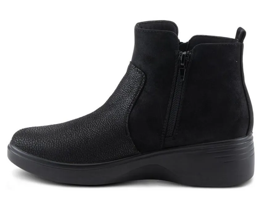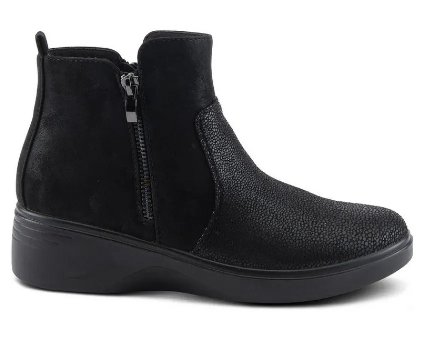 A sleek wedge bootie with embossed texture on a stretch-friendly upper for a smooth, flattering fit. Dual zips and a pull tab simplify entry, while the wedge adds a subtle, walkable lift. Clean lines and a compact shaft make it a wardrobe-easy pick.