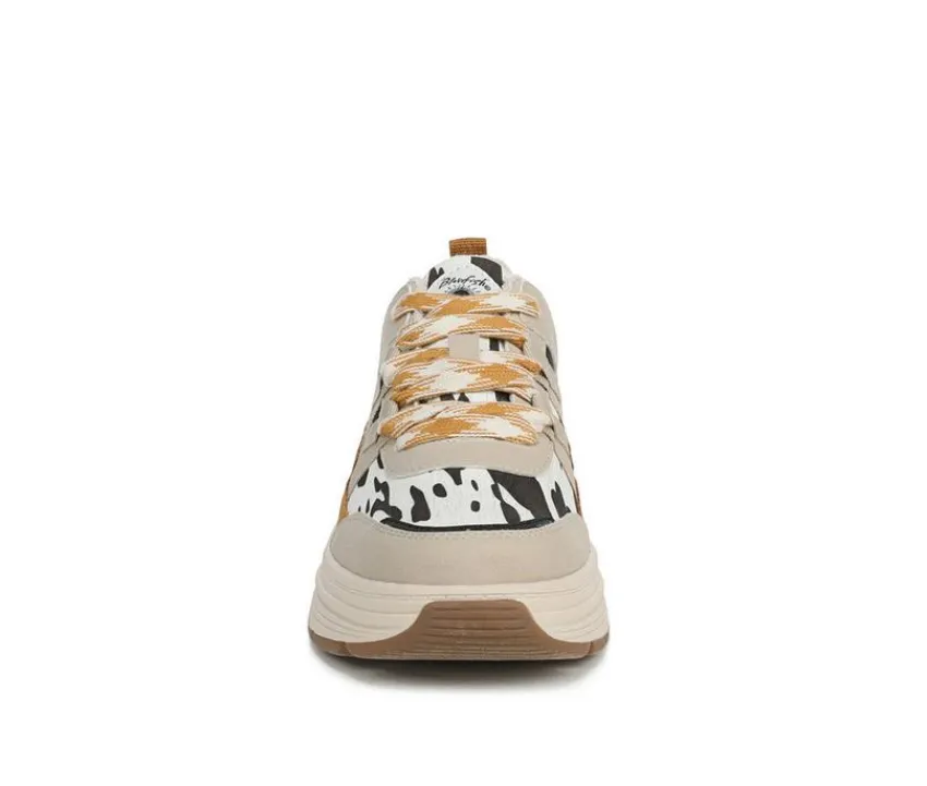 This platform sneaker delivers playful energy with a bold, layered sole. A mixed faux suede, fabric, or leather-inspired upper creates visual interest throughout the design. Lace-up styling provides a secure fit, while the round toe supports everyday wear. A pull tab at the heel adds convenience. Finished with a chunky platform sole for standout style.