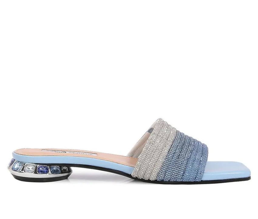 Add a pop of texture and sparkle to your warm-weather wardrobe with these standout slip-on sandals. The wide, woven upper shimmers with glittery detail, bringing playful glam to your look while keeping things breezy. A sculpted low heel wrapped in rhinestones adds eye-catching charm with every step. With an open square toe and easy-on design, these sandals strike the perfect balance of fashion and convenience for sunny days and stylish nights.
