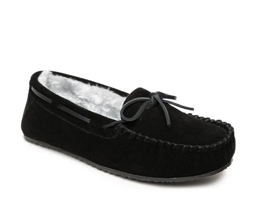 These classic moccasin-style women’s slippers go on with ease. Soft faux fur lining wraps your feet in warmth for cozy days at home. Soft suede or statement-making fabric prints add a touch of cheerful fun to your feet.
