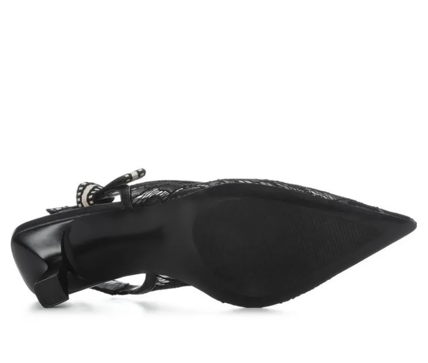 Chic and timeless, these slingback pumps bring playfull elegance to any outfit. Designed with pointed toes and sleek cutlines, the shoes stand out with their mix of refined textures and sheer lace detail for a femenine finish. A ribbon-accented slingback strap adds a charming touch while keeping the fit secure.