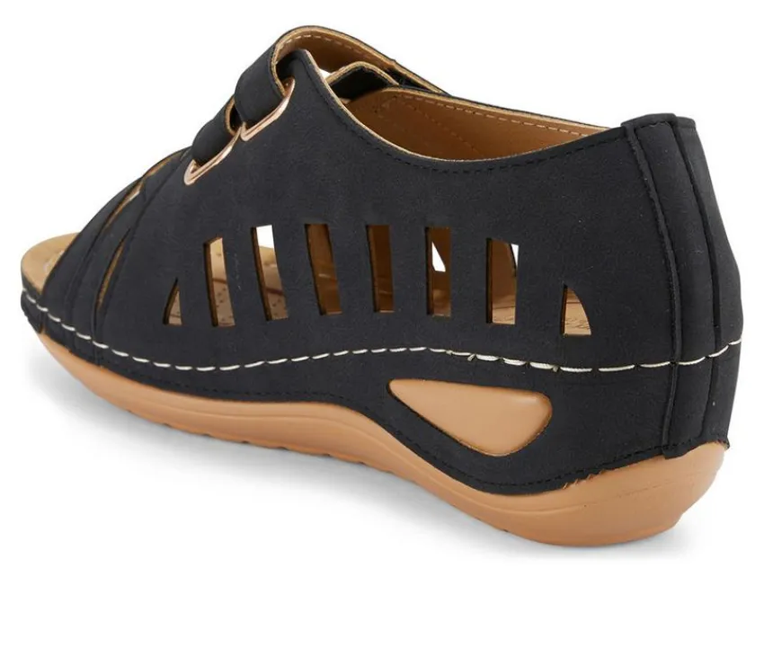 A practical sandal with structured coverage and subtle cutouts. Featuring a faux suede upper with two adjustable straps, this open-toe style combines ease and functionality with a molded sole and stitched detailing.