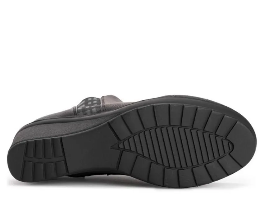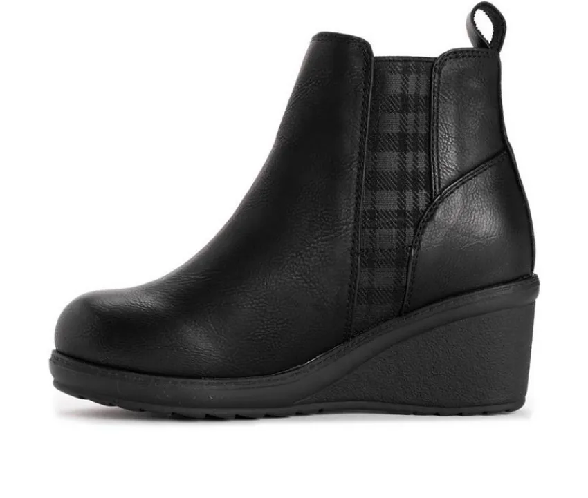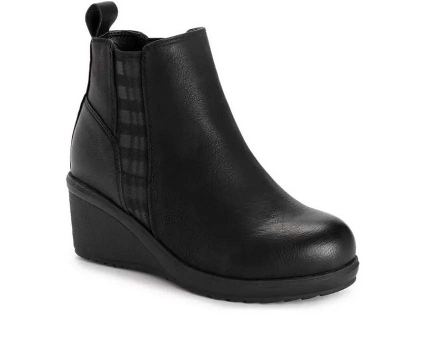Make every step count in MUK LUKS® Women’s England Oxford Wedge. This wedge ankle bootie has a detailed plaid elastic gore that allows added flexibility for easy on and off while memory foam insoles offer you superior support and comfort all day long. Wipe with a damp cloth to clean, no bleach, lay flat to dry. Imported. Durable TPR Sole. 100% Polyester Faux Fur Insole. 100% Polyurethane Upper. 100% Polyester Faux Fur Lining. 2.5 Inch Wedge Heel. Memory Foam Insole. Multiple color options available. Women’s Whole and Half Sizes 6-11.
