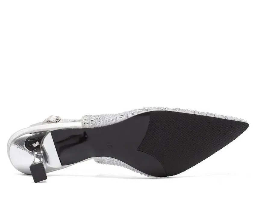 Dazzle at every occasion with these elegant slingback heels designed to shine. Crafted with a sparkling mesh upper and a pointed toe, this style offers both glamour and sophistication. The adjustable slingback strap ensures a secure fit, while the low 2″ heel gives just the right amount of lift without sacrificing comfort. Perfect for weddings, parties, or special nights out, these heels make every step unforgettable.