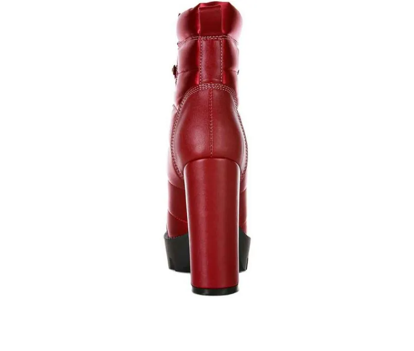 Rich satin Quilted boots with metallic eyelet detail is a bad ass statement biker boot. The high heeled ankle boot has multi panel construction and comes with side zipper opening. The high platform log sole adds to the utility and looks.