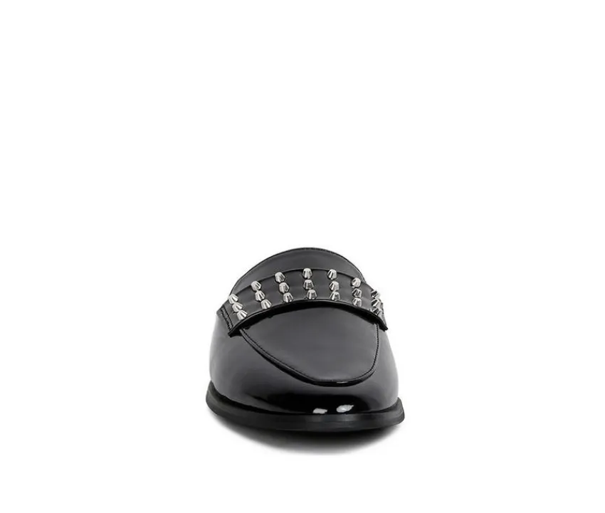 Flat casual mules for women; it has lighlty padded insole which gives ample support. The metal studded detail adds detail to the shiny patent almond toe flats. The low heel is a comfortable semi casual style for all day wear. Type: Mules. Heel Type: Flats. Almond Toe Upper Material: Patent Leatherette. Lining: Soft Leatherette. Outsole: Rubber. Metal Studs. Softly Padded Insole. Semi Casual Flats for Women. RCSH4052.