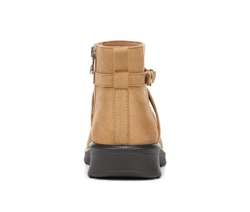 With a softly slouched silhouette and buckle accent, this ankle boot delivers everyday comfort with casual charm. The synthetic upper features a wraparound strap for added style, while an inside zipper ensures easy on and off. A cushioned insole keeps each step supported, and the low wedge heel provides a touch of lift without compromising stability. Finished with a textured outsole for reliable grip, this versatile boot is perfect for daily wear in cool weather.