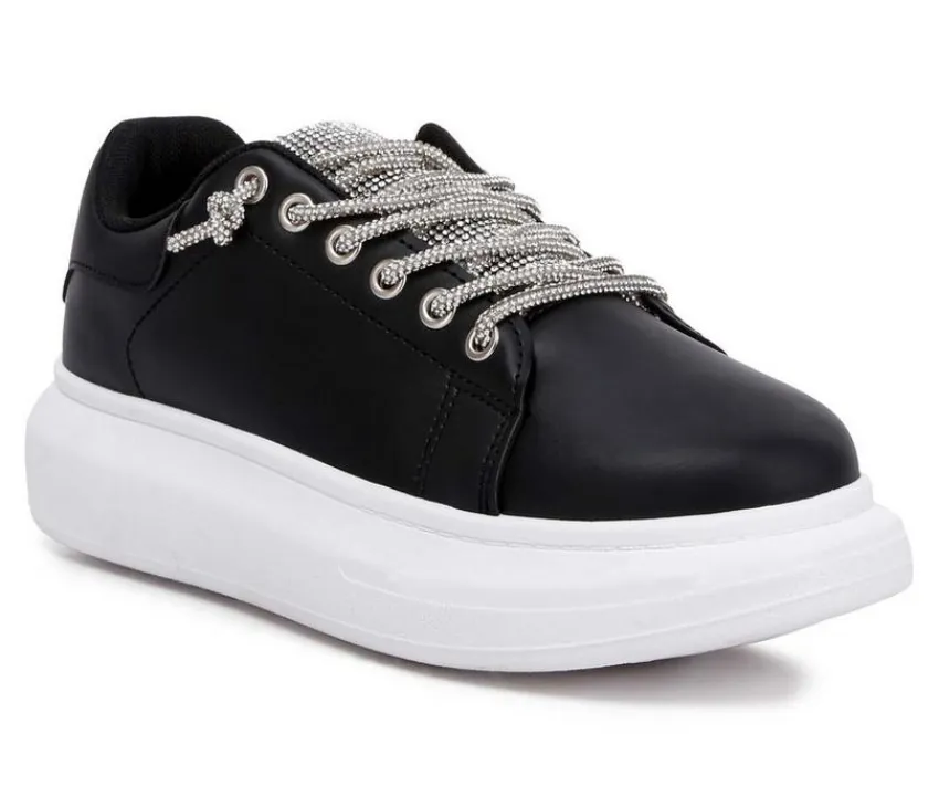 The chunky sneakers exhibit an enigmatic aura with the rhinestones embellished laces and tongue and the exaggerated chunky soles. The shoes are sure to amp up your fit with the eye-catchy bling and boldness and give a relaxed fit with the light cushion insoles.