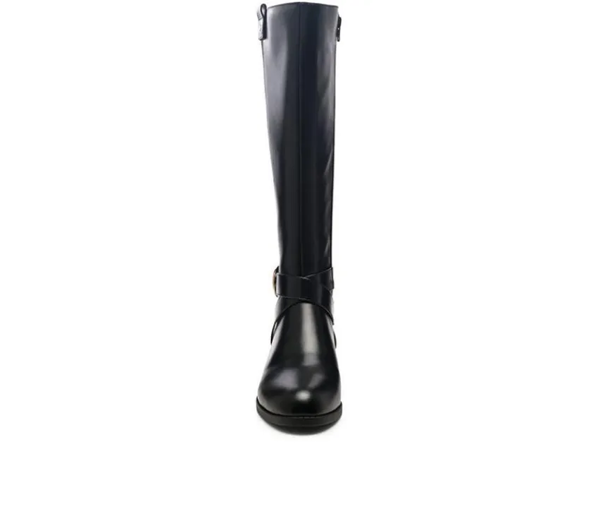 Zip -Up Knee High Winter Boots with comfortable almond toe and buckle detail around ankle. Upper Material: Vegan Leather. Lining Material: Vegan Leather Outer sole: TPR. Closed Round Toe. Knee High Boots. Side Zipper Opening. Durable TPR Outsole. Almond Toe. Metal Buckle Detail. SH2555.
