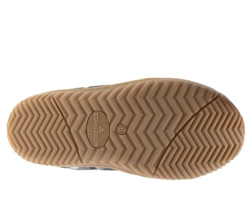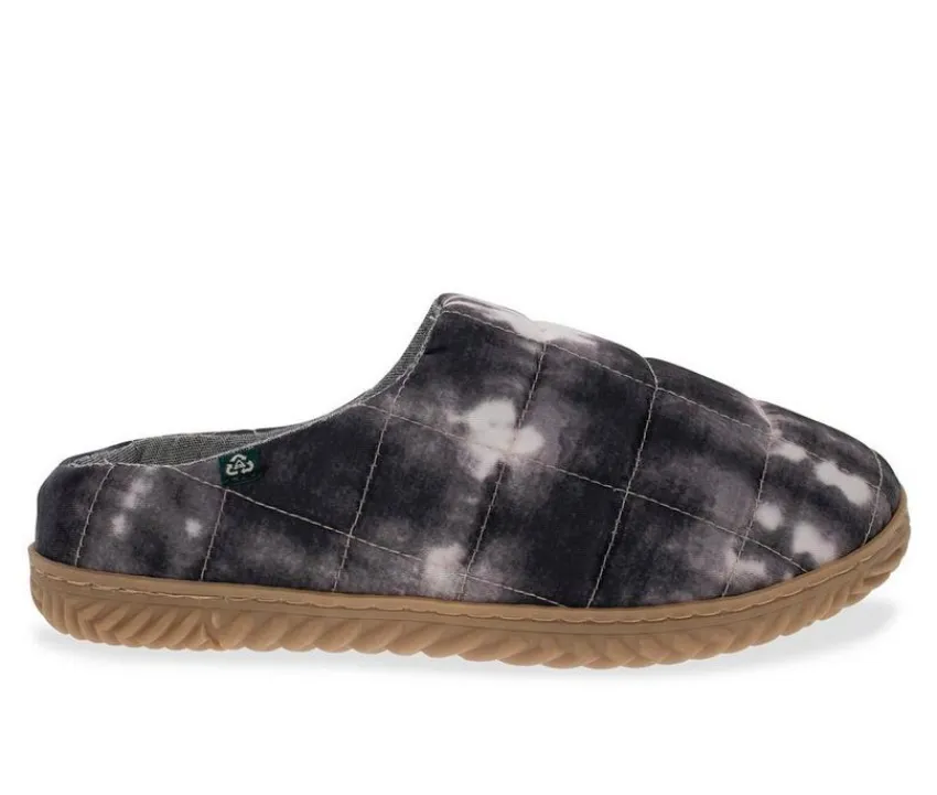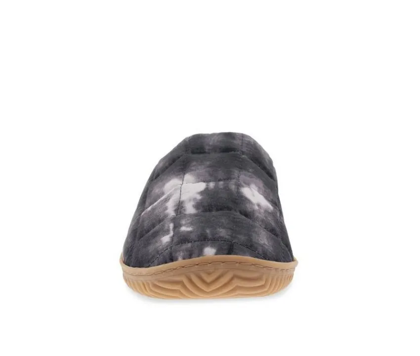 Lush, plush quilted comfort in black and creamy tie dye burts. Padded pillowy softness warmly hugs feet with a cushioned insole and cotton lining. Quilted comfort at its coziest! Easy slip on/off. All-natural gum rubber and almond round toe. Like a hug from your favorite sleeping bag.