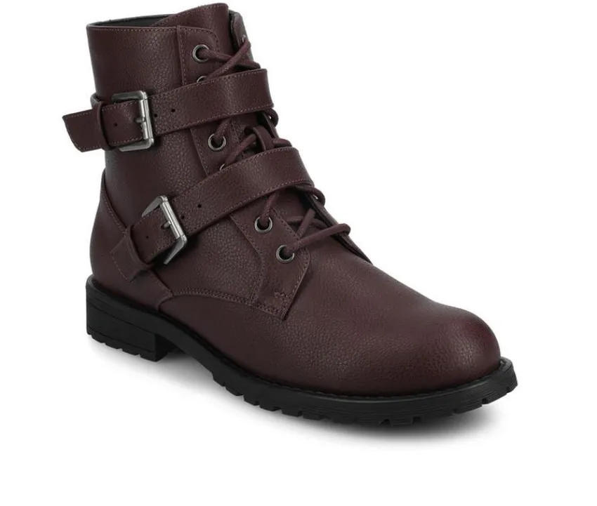 These ankle boots bring a modern edge with buckle details and a secure lace-up front. Designed with a round toe and cushioned interior, they offer both comfort and contemporary styling. A block heel adds subtle lift, making them versatile enough for casual or polished looks.