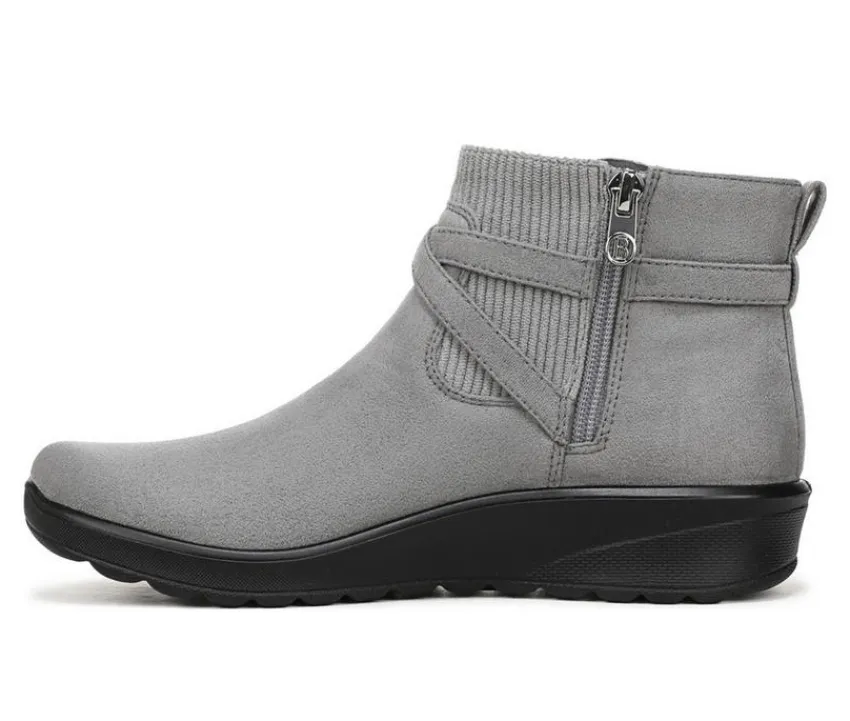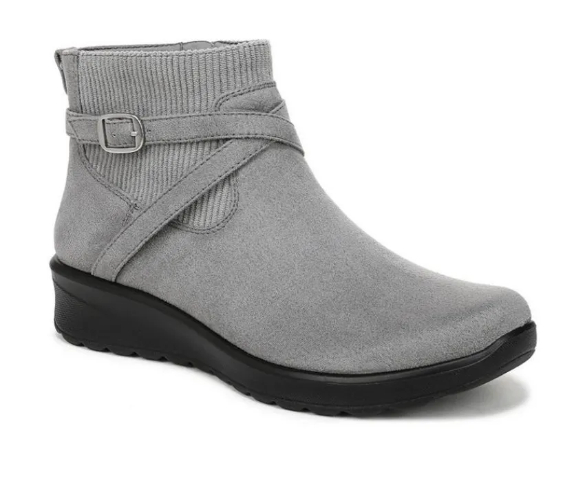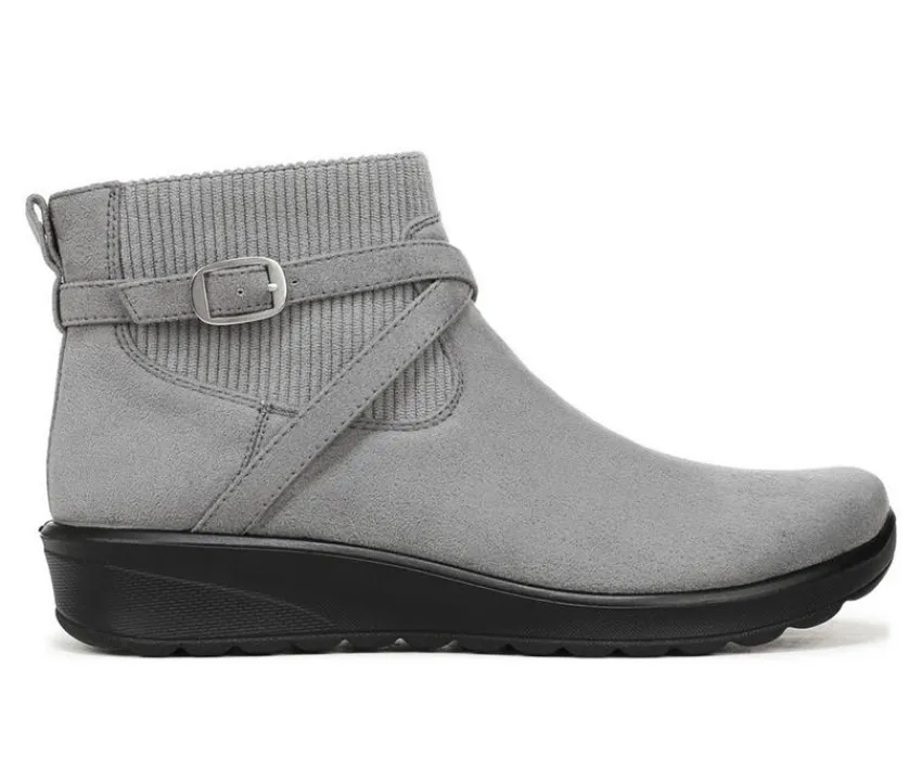 With a softly slouched silhouette and buckle accent, this ankle boot delivers everyday comfort with casual charm. The synthetic upper features a wraparound strap for added style, while an inside zipper ensures easy on and off. A cushioned insole keeps each step supported, and the low wedge heel provides a touch of lift without compromising stability. Finished with a textured outsole for reliable grip, this versatile boot is perfect for daily wear in cool weather.