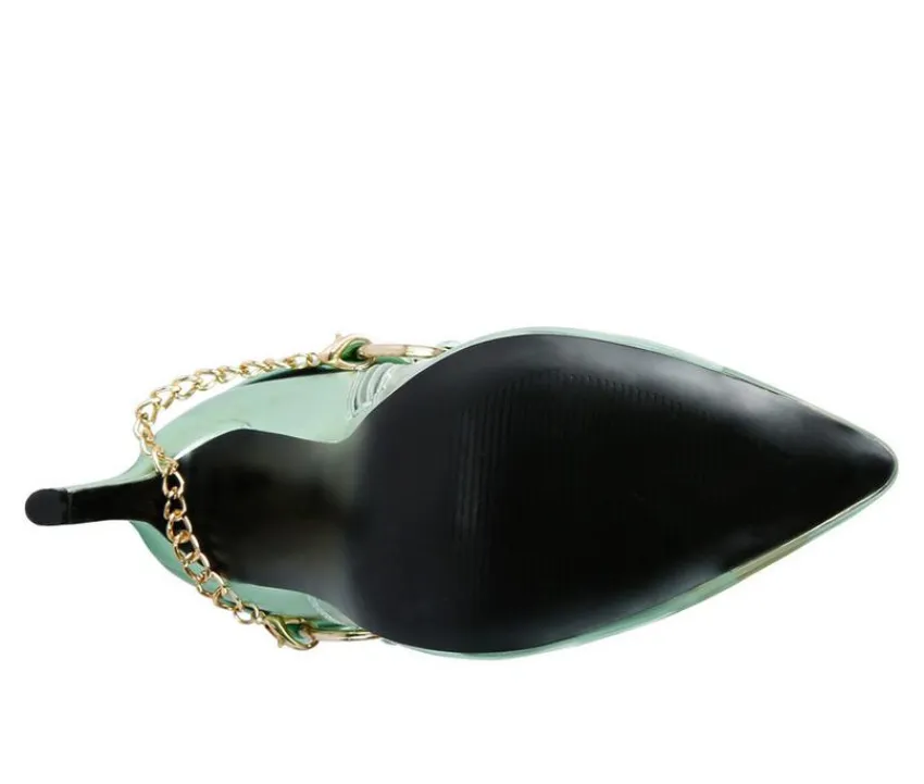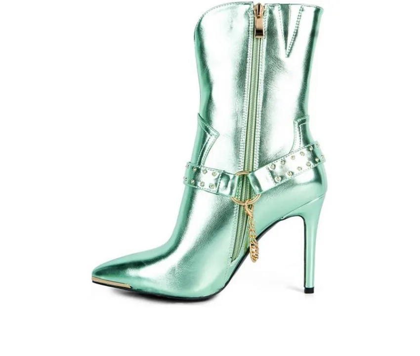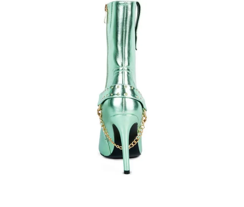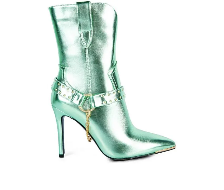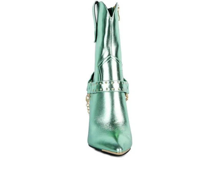Giving a vibe of the countryside – this pair of high-heeled ankle bootie has classic cowgirl boot detail along the ankle hem. The elasticated gussets give some stretch and flexibility for fit. The look is accentuated by metal detail on the pointed toe and chain/harness detail.