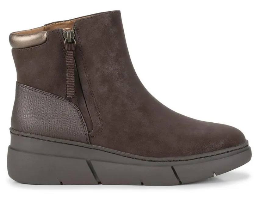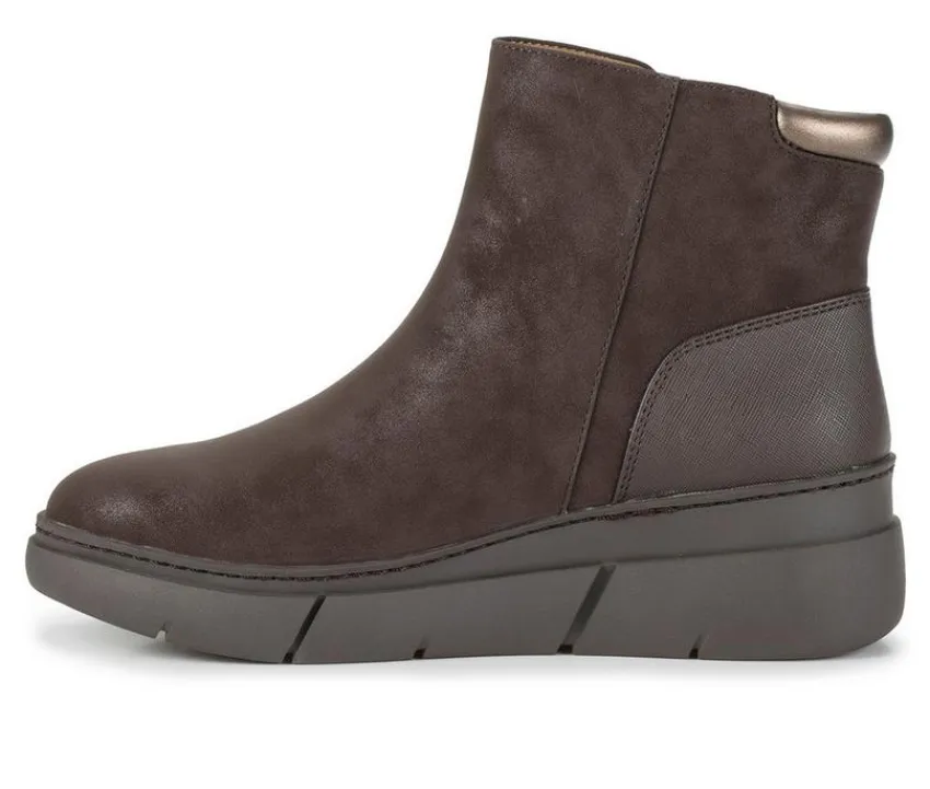Elevate your everyday with this stylish wedge boot designed to keep you looking sharp and feeling supported. The shimmering textured upper brings eye-catching appeal, while the low wedge heel gives just the right amount of lift without sacrificing stability. A side zipper allows for easy on and off, and the cushioned footbed makes these a go-to choice for all-day wear. With a sleek profile and subtle shine, this boot adds polish to any casual look.