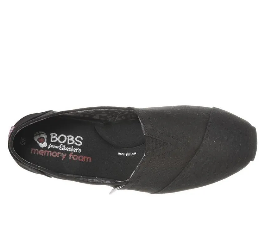 Women’s BOBS Slip-On Casual Canvas Flats. Spread the peace, love and Bobs with the Skechers Bobs Plush – Peace & Love! These slip-on alpargata flats feature a tucked toe pleat front, elastic stretch panel for comfort fit, and a cushioned Memory Foam insole. Get new shoes and share the love, for every pair of Bobs shoes sold, Skechers will donate a pair of shoes to a child in need!