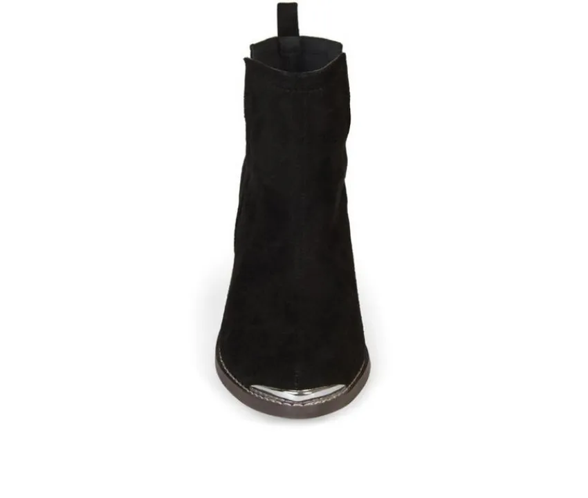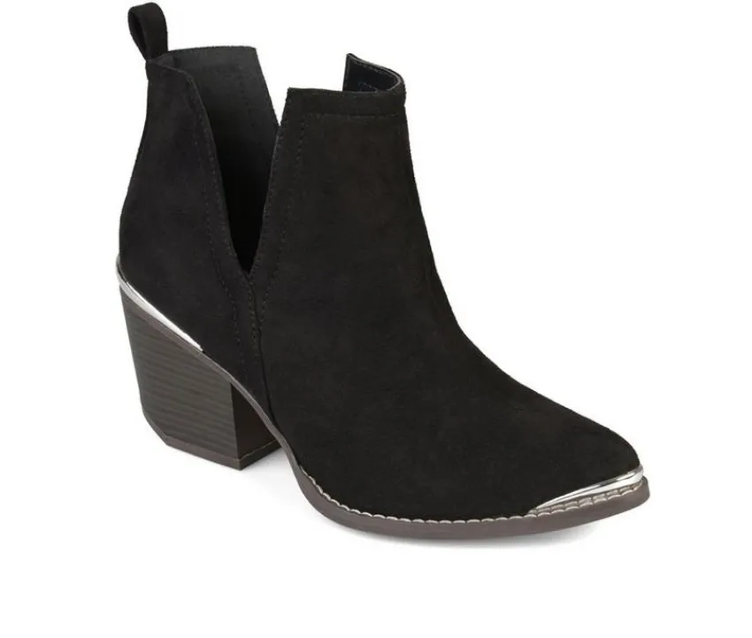 Rock the hottest trend this year in metal detail side split ankle booties by Journee Collection. These ankle booties feature soft faux suede uppers with chic side split detail on each side. Metal detail accents the toe tip and back heels to enhance the look