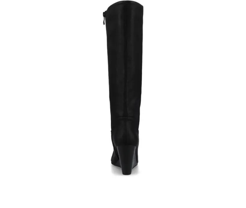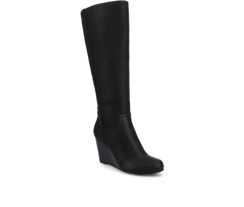 Show off classic design in wedge boots by Journee Collection. These fashionable boots are made with soft faux leather uppers that rise mid-calf and feature an inside zipper foot entry. Stacked wedge heels complete the style.