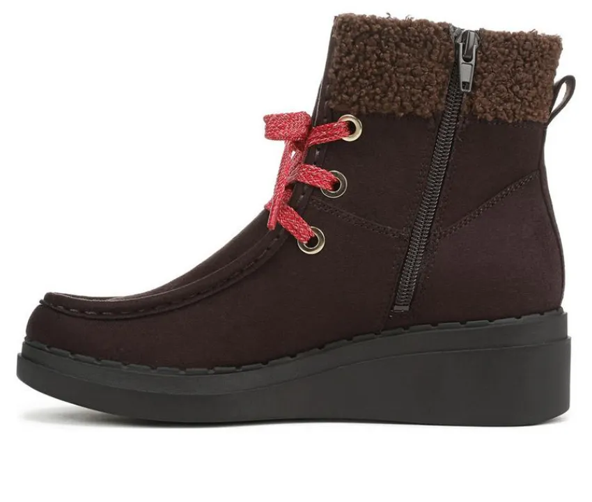 Designed to bring cozy comfort and standout style to cool-weather days, this wedge ankle bootie is the perfect mix of casual flair and supportive lift. The soft synthetic upper features moc-toe stitching and bold metal eyelets, while a lace-up front allows for a customizable fit. A sweater-knit collar adds a warm, textured touch around the ankle, and the cushioned insole ensures comfort all day long. The low wedge sole gives you just the right boost with stable support for every step.