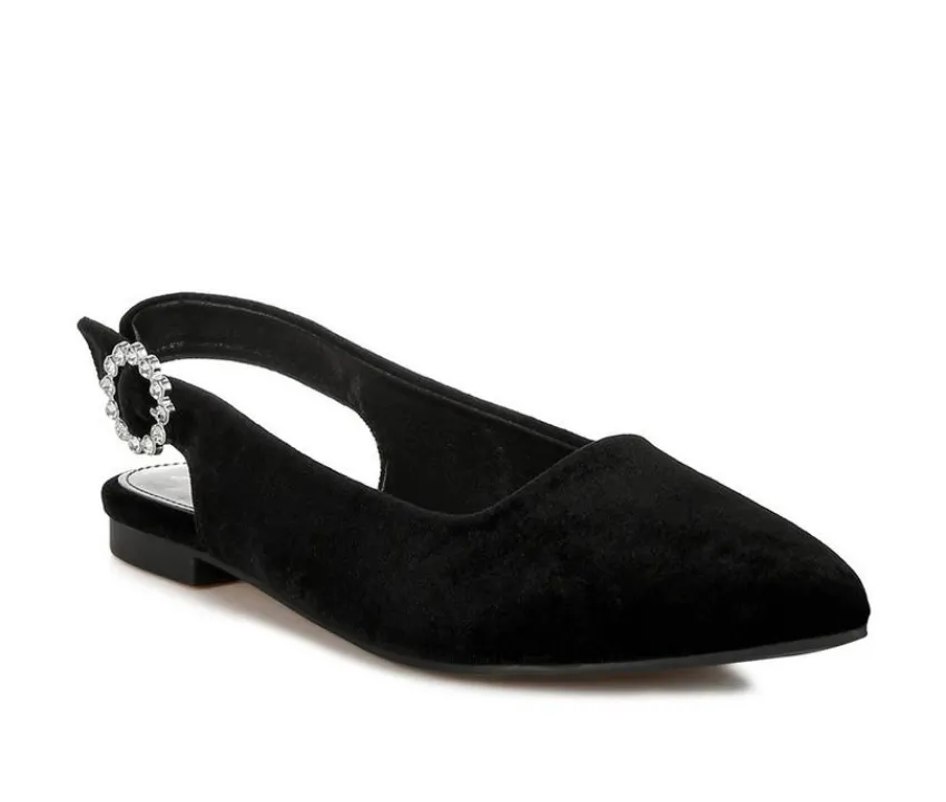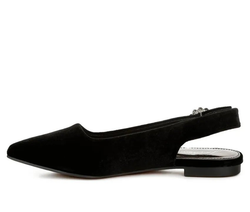 A luxe-looking flat with evening appeal, this velvet slingback features a pointed toe and rhinestone-trimmed buckle. The cushioned insole and low profile keep it wearable from reception to last dance. Elegant, fuss-free, and ready for dressy occasions.