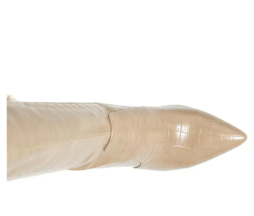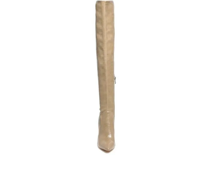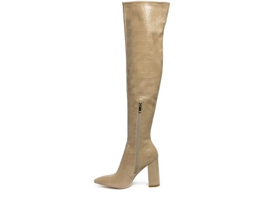 Pair of beautiful block heeled thigh-high boots with options to choose from: fine faux suede, printed faux leather and croc textured solid. The knee-high boot has a zipper opening and comes in sturdy block heels. Be all ready for winter within the pointed toe boot in suede – keep warm!Upper Material: Faux LeatherLining Material: Man MadeOuter Sole: RubberBlock HeelPointed ToeThigh High BootsZipper OpeningWinter BootSH2545