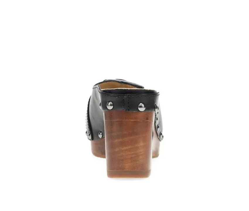 A bold platform slide with sculptural lines and edgy hardware. Featuring a leather upper with a buckled strap and stud accents, this open-toe sandal is grounded by a carved wood-look heel with cutout detailing for a retro-modern finish.