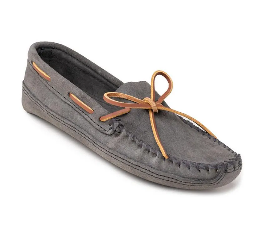 Crafted for cozy relaxation and everyday durability, this double-bottom moccasin flat wraps your foot in comfort with a traditional, hand-stitched design. The soft suede upper molds gently to your foot, while the rawhide lace and whipstitch accents keep the look timeless. A second layer of suede on the sole offers added durability and structure, creating a classic softstep feel perfect for indoor wear. This is a heritage-inspired style that brings authentic comfort home.