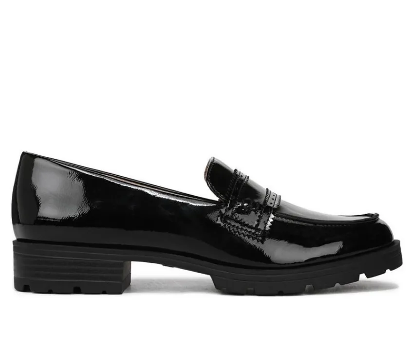 Step into timelessness. A casual penny loafer like this belongs in your cart and on your feet. Faux leather upper with a rounded toe, slip-on fit, stitched details, and lug sole. Vamp and sock lining, toe box and heel counter partially crafted with recycled materials. Soft System® comfort package provides all-day support, flex, and cushioning. Traction platform sole provides you with extra stability. Just Right Height 1 and 1/4 inch block heel.
