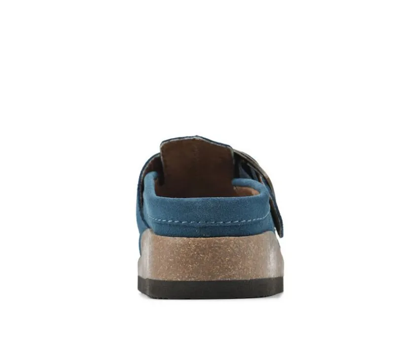 The Bueno by White Mountain Shoes is a classic moccasin-style clog that is right on trend. This clog has a contoured footbed to hug your foot and a soft cork bottom for maximum comfort. The oversized statement buckle makes this clog stand out. This shoe is perfect to throw on when it’s chilly and is made out of genuine leather that lasts!