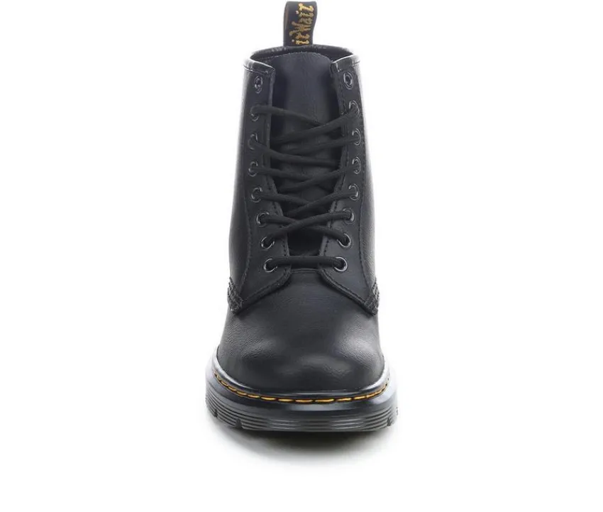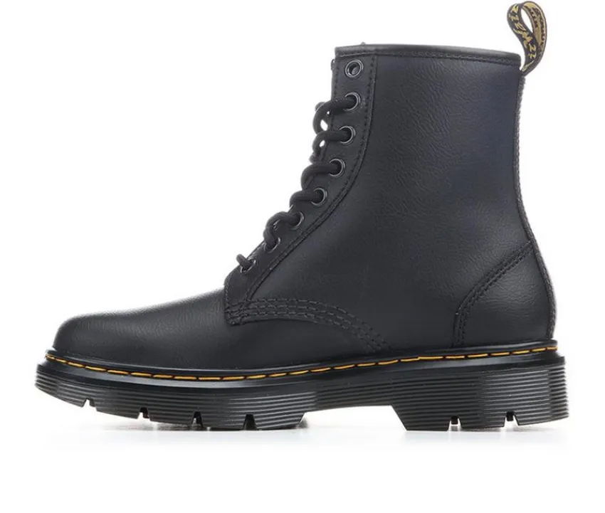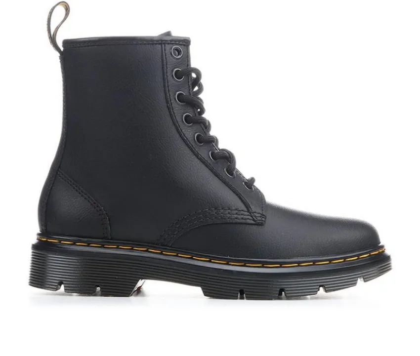 Bring iconic edge to your wardrobe with the Women’s Dr. Martens Aprile 8 Eye Booties. Crafted with a smooth leather upper, this combat-inspired style features the signature 8-eye lace-up design for a bold, timeless look. A chunky lug outsole delivers durability and traction, while contrast welt stitching adds classic Doc style. Finished with a back pull tab for easy entry, these boots are built for everyday wear with an attitude.