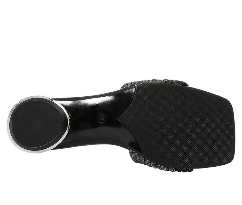 Add a pop of texture and sparkle to your warm-weather wardrobe with these standout slip-on sandals. The wide, woven upper shimmers with glittery detail, bringing playful glam to your look while keeping things breezy. A sculpted low heel wrapped in rhinestones adds eye-catching charm with every step. With an open square toe and easy-on design, these sandals strike the perfect balance of fashion and convenience for sunny days and stylish nights.