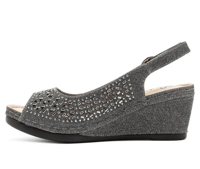 Shine through every step in these eye-catching wedge sandals designed for comfort and glamor. The upper sparkles with allover rhinestones, while an open toe and slingback strap keep things breathable and secure. A wedge heel adds a flattering boost without sacrificing stability, making them perfect for everything from casual celebrations to formal nights out. With an adjustable strap and cushioned insole, these sandals offer a personalized fit and easy wear that lasts all evening.