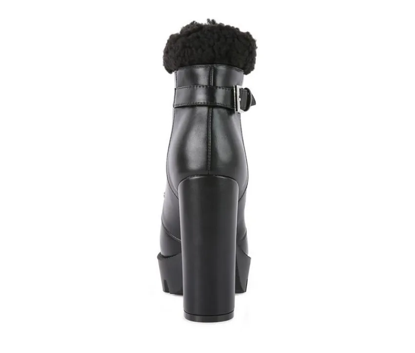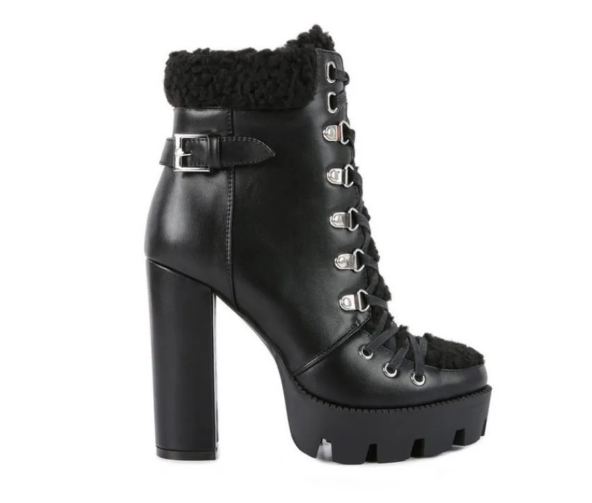 Chunky Sole High-Heeled Biker Boot made on a high platform. The stylish biker boot has metallic eyelets detail and comes with a side zipper opening. A stylish winter boot – it has faux shearling fur cushioned collar.