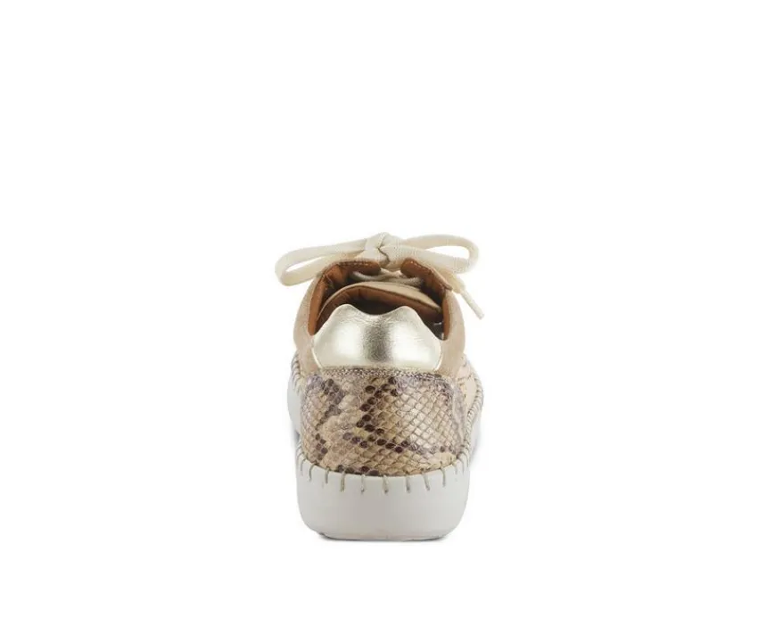 Calling all fashionistas on the go. Round out your footwear collection with this gem of a sneaker. Mixed media sneaker metallic, leather, suede and snake print featuring elastic laces for the perfect comfort fit.