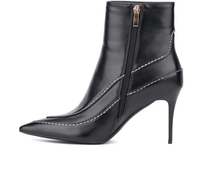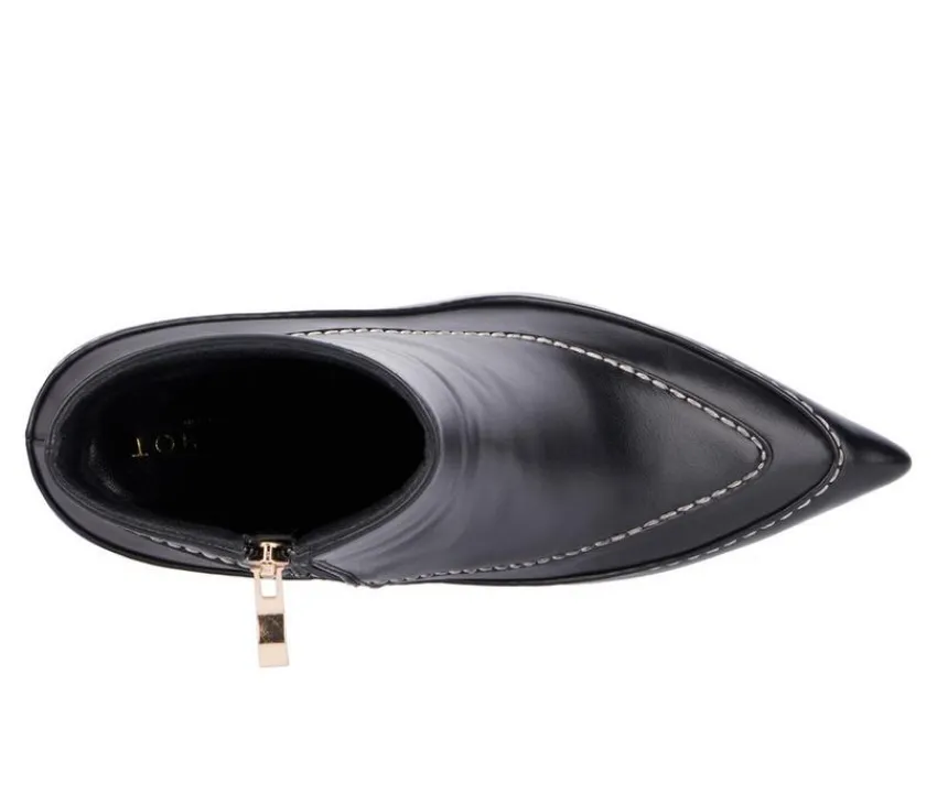This pointy boot features a zipper closure and faux fur lining, ensuring a snugly fit throughout the day. The thin high heel adds an extra touch of refinement, while the white stitching details on the upper adds an element of fresh sophistication.