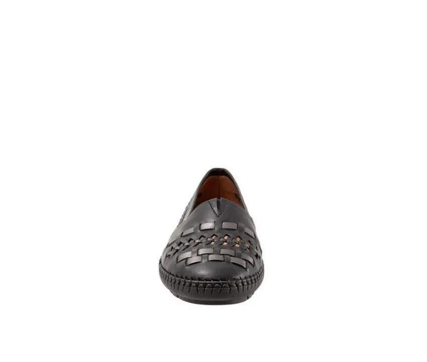 A casual slip on shoe with a removable footbed and woven details for a bohemian style.