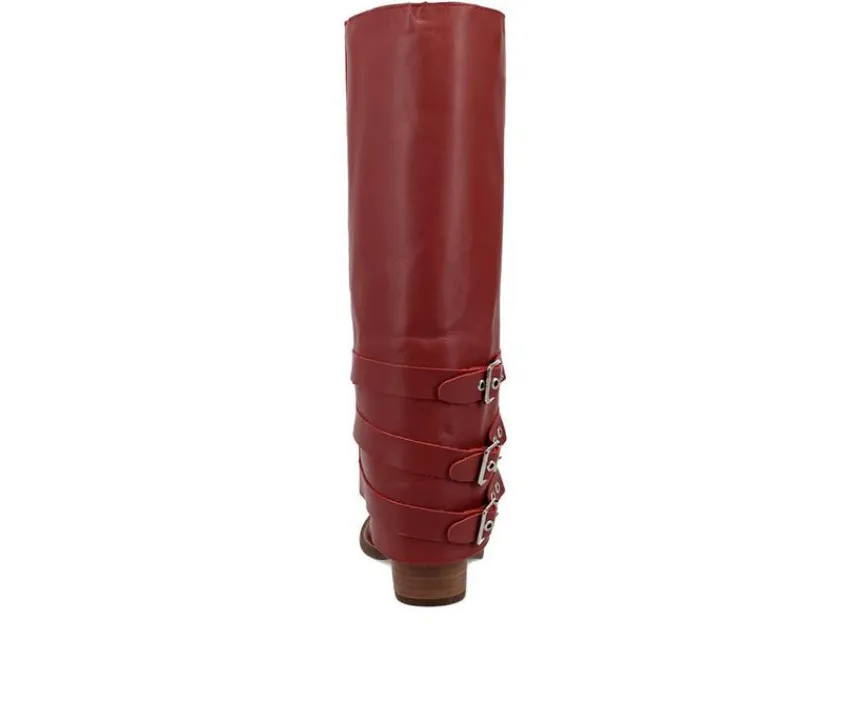 Make a bold entrance with this knee-high boot, blending western edge with statement style. Designed with a smooth upper and dramatic overlay that sweeps across the foot, this fashion-forward silhouette channels iconic cowgirl flair with an urban twist. Three metallic buckle straps along the side add attitude and custom flair, while the pointed toe and block heel give just the right touch of polish. Perfect for styling with jeans or skirts, it’s built to turn heads from the ground up.