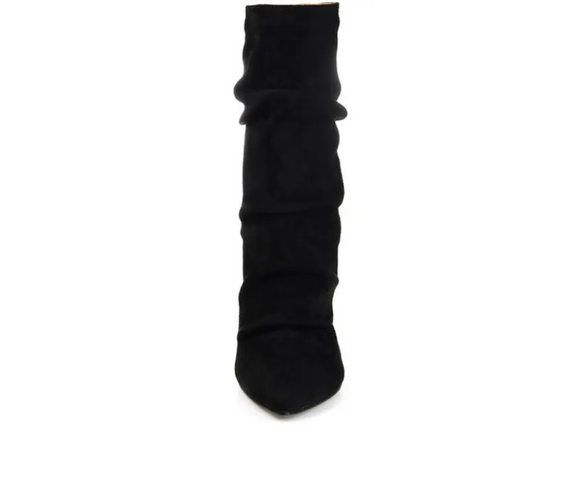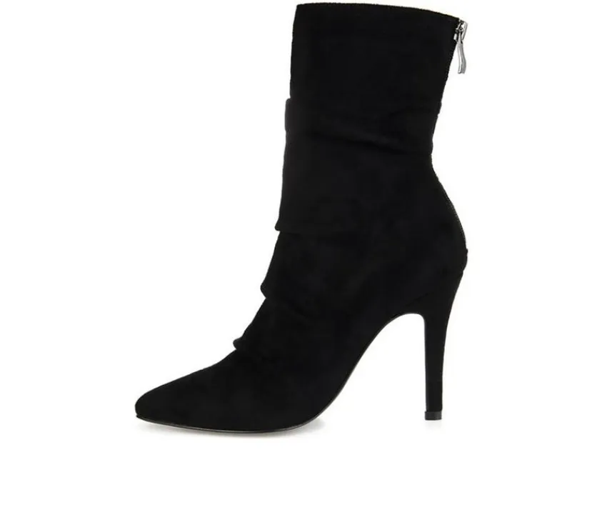 A shapely bootie featuring a pointed-toe and slouchy details. The Markie by Journee Collection is a flirtatious look rendered with vegan leather uppers fastened by a back zipper entry. A slender stiletto heel and a cushioned footbed ground this design.