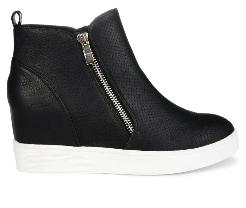 Need a lift? The Pennelope sneaker by Journee Collection features a lofty hidden wedge heel lined with a cushioned footbed for a comfortable elevation. Round perforations cover this vegan leather design, and silver tone zippers at the sides finish the look.