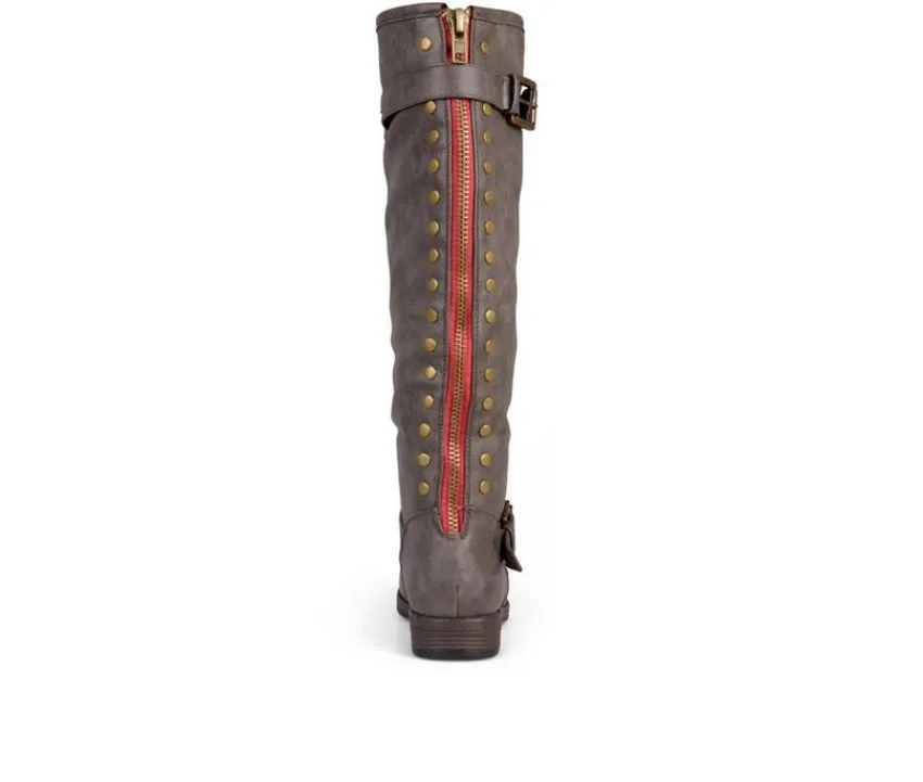 Set the trend this season in studded Spokane riding boots by Journee Collection. These chic boots feature premium faux leather uppers that rise to a knee height and feature a back zipper with stud detail. This boot is also available in a wide-calf boot style.