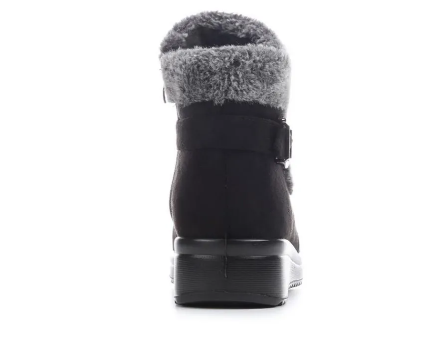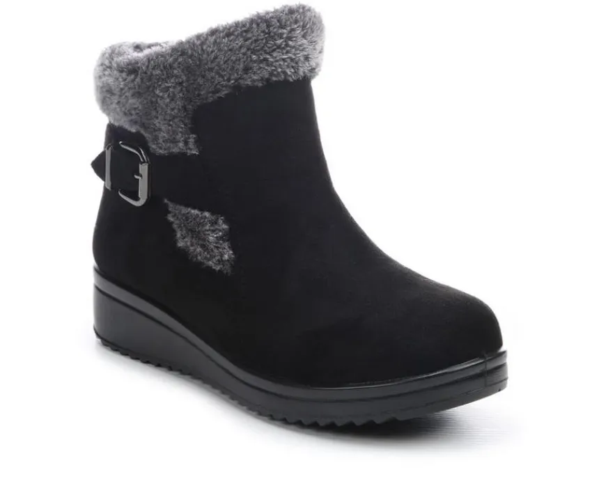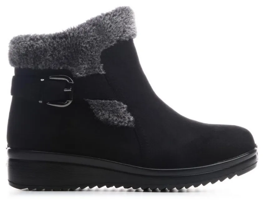 - Plush faux-fur lining surrounds feet in softness and warmth