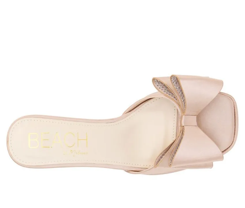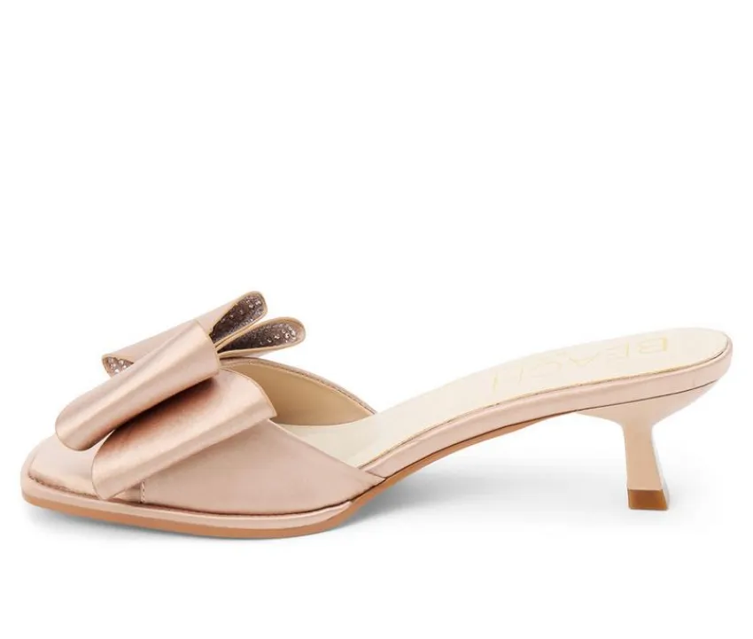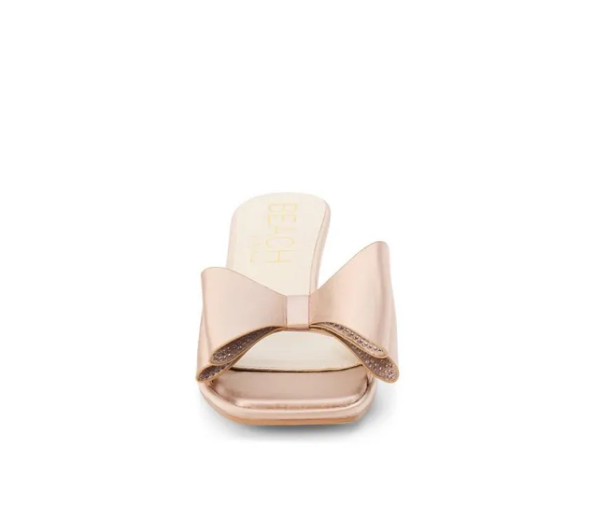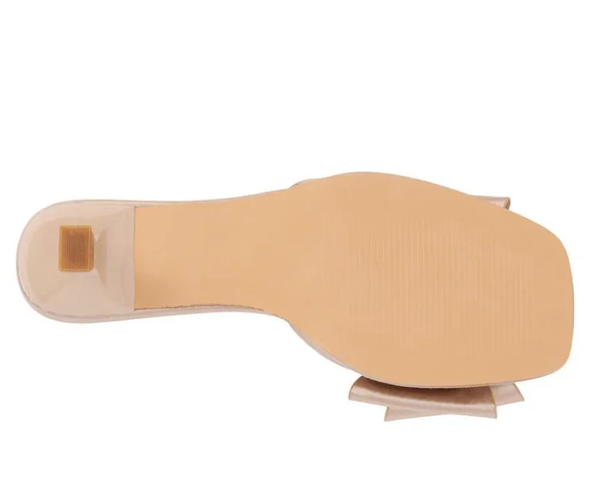Turn heads with every step in this playful yet elegant heeled sandal designed to add flair to dressy outfits. Featuring an oversized bow accent and open-toe silhouette, this style blends charm and sophistication in all the right ways. The sleek synthetic upper and slip-on design offer both ease and a streamlined look, while the sculpted kitten heel provides just enough lift for special occasions or stylish nights out. It’s a standout piece that’s equal parts fun and fashion-forward.