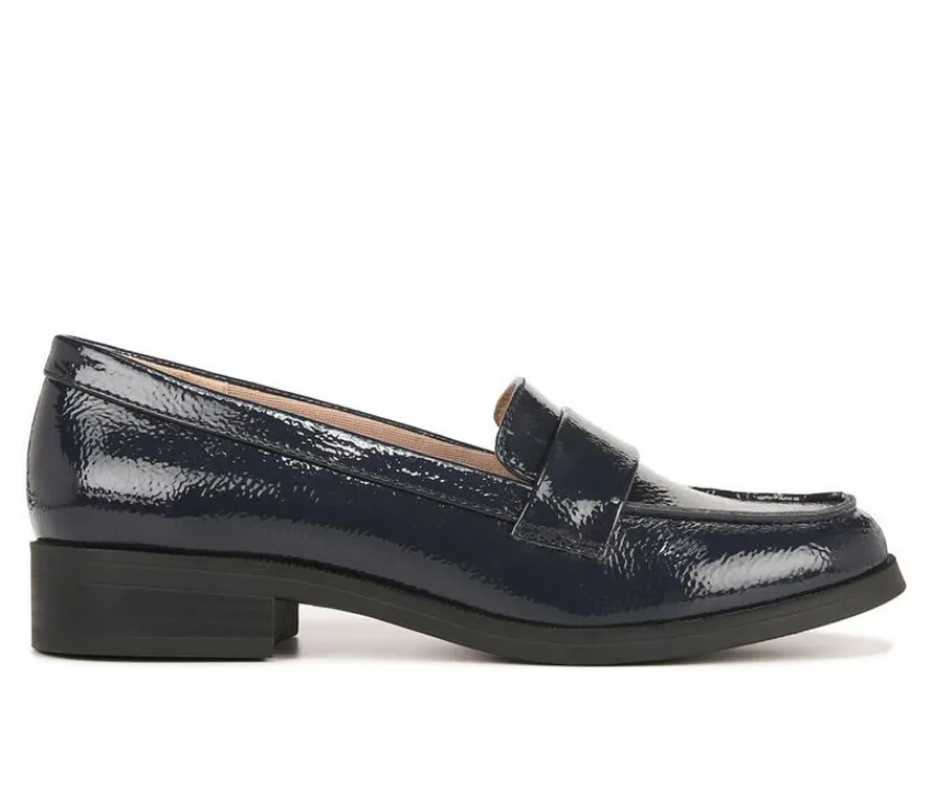 Classic moc loafers with modern flair. These womens slip on shoes always look chic. Faux leather or patent upper with a round toe, slip-on fit, and strap detail. Toe box, heel counter, and linings partially crafted with recycled materials. Soft System® comfort package provides all-day support, flex, and cushioning. Active Arch® contoured insole with extra arch support and cushioning. Traction sole provides you with extra stability. Just Right Height 1.125 inch block heel.